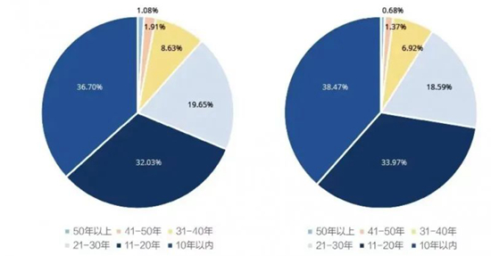 图 10:2020年存量住房房龄结构(左:户数,右:面积)
