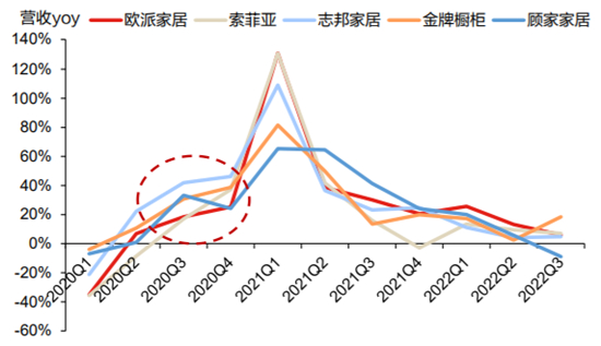 复盘2020年来看,家居需求在疫情爆发期间显著下降,且龙头当时缺乏线上蓄客的运营经验,后续随着Q3、Q4疫情封控放松,龙头企业营收增速逐季明显改善。