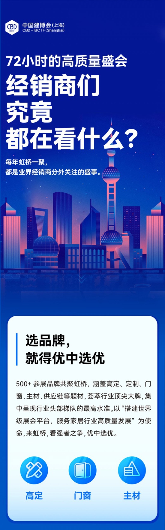 500+参展品牌共聚虹桥,涵盖高定、定制、门 窗、主材、供应链等题材,荟萃行业顶尖大牌,集 中呈现行业头部梯队的最高水准。以“搭建世界 级展会平台,服务家居行业高质量发展”为使 命,来虹桥,看强者之争,优中选优。