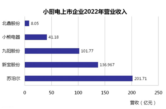整体来看,在已经披露2022年成绩的5家上市企业中,苏泊尔、新宝股份、九阳股份营收位列前三,且皆处于百亿梯队。其中苏泊尔为201.71亿元、新宝股份136.97亿元、九阳股份101.77亿元。
