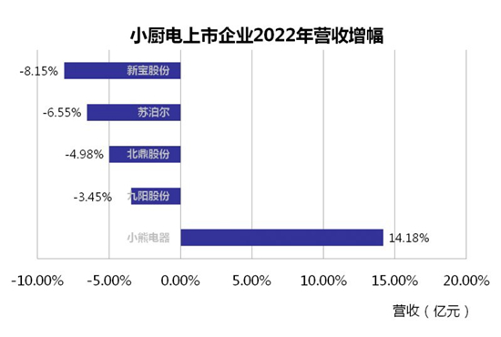 从2022年全年营收增幅来看,仅有1家实现营收的逆势增长。财报显示,新兴小厨电代表企业小熊电器 2022 年实现收入 41.18亿元,同比增长14.18%。尽管整体营收与苏泊尔、新宝、九阳存在一定差距,但增长势头强劲。