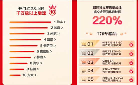 在各项利好措施以及政策扶持的推动下,嵊州市厨具行业协会携手一批本土优秀的集成厨电企业与京东家电建立了战略合作,并在京东618开门红28小时中取得了不俗的战绩,帅丰占据了千万级以上增速榜的TOP1;其中,帅丰TJ3-8B-90独立蒸烤集成灶、森歌T3SZK-G独立蒸烤集成灶、亿田S8A独立蒸烤集成灶占据蒸烤集成灶单品TOP榜前三,这些来自嵊州集成厨电产业带源头的产品受到了广大消费者的青睐。