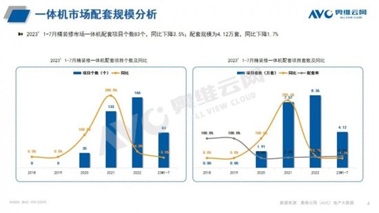 根据奥维云网(AVC)地产大数据显示,2023年1-7月,商品住宅精装开盘项目总计745个,同比-31.6%,精装规模44.90万套,同比-45.3%;其中7月精装规模7.53万套,环比-11.0%,较6月精装规模有所下降。其中2023年1-7月厨电六件套(烟灶消洗、单功能机、一体机)精装配套项目720个,同比-31.7%,精装规模117.37万套,同比-44.8%。