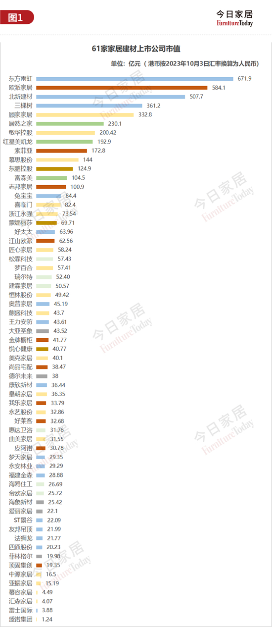 上图统计了61家家居建材上市公司2023年10月2日的市值数据。市值上100亿的企业有13家,建材/其他、定制家具、成品/软体、家居卖场各3家,瓷砖1家。