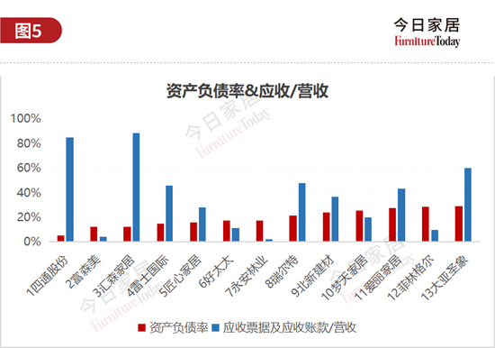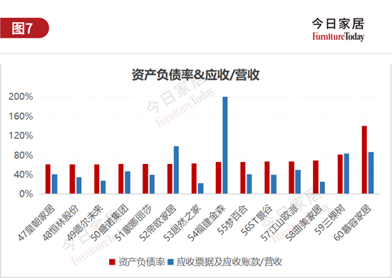 上图列出了资产负债率超60%的14家企业,成品/软体6家,建材/其他3家,地板、卫浴、家居卖场、定制家居各1家。