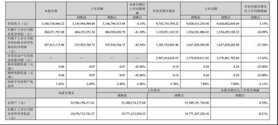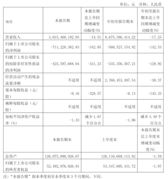 但在归母净利润上,第三季度内,7.11亿元的亏损,直接让这个数据比去年同期减少了342.85%。而其第一季度1.46亿元和第二季度481.94万元的利润虽然同比去年下滑明显,但至少保持在正值。