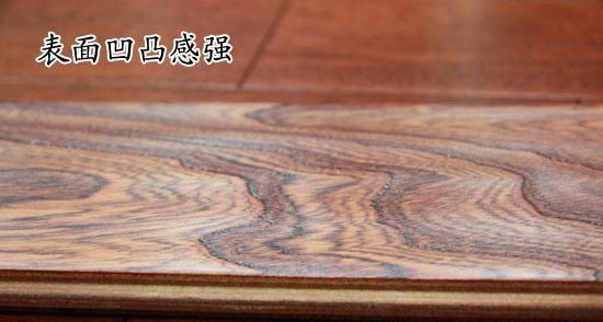 从侧面看可以看到明显的凹凸,立体感十足。地板表面为天然树皮,花纹完全手工雕刻,显得十分自然。减少机器的压制,也减少了碳排放。