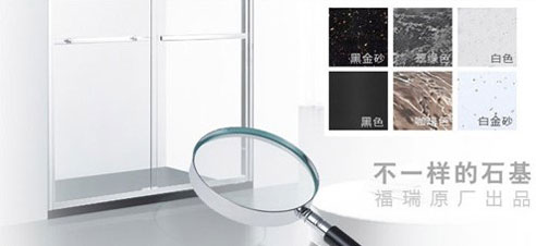 福瑞淋浴房, 采用人造石基底座,之地坚硬,非常稳固耐用。型材底部配嵌式挤压胶条,密封性更好,免打玻璃胶,美观、环保、健康。