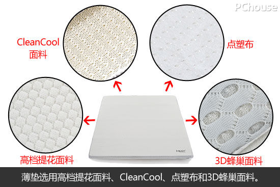 表面采用高档提花面料让床垫摸起来手感轻柔细腻,经过专业防菌工艺处理,同时具有防静电、抗过敏的特点;内层采用CleanCool面料,超强抗菌,有效除臭;底层点塑布材质,防止床垫随意移动;床垫侧面特别采用了3D蜂巢面料,具有通气排湿的作用,让床垫时刻保持干爽舒适。