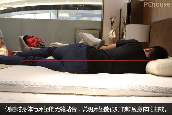根据很多人的喜好,将薄垫和床垫叠加来使用,请一名成年男性进行试睡,可以观察平躺过程中,身体与床垫依然是无缝贴合的,而且未见深深塌陷的情况。