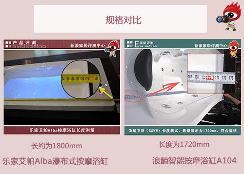 对比结果:我们对乐家艾帕Alba按摩浴缸的外部尺寸进行了一番测量,发现其长约为1800mm,宽为900mm,相对宽敞的空间设计在中国市场上比较少见,但也符合大多数中国人的身高,让人联想到恢弘大气的西班牙王室的尊贵感。浪鲸(SSWW)智能按摩浴缸A104虽然长宽都比乐家要稍短点,但也是符合标准规格的,适合大中型浴室空间。