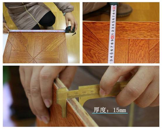 实木地板的厚度直接决定地板的用材量,我们对地板的尺寸进行了测量,测得地板的两边宽45mm,地板厚度为1.5mm,与地板所标注的规格一致。每一块地板的尺寸都是如此,没有丝毫的误差。