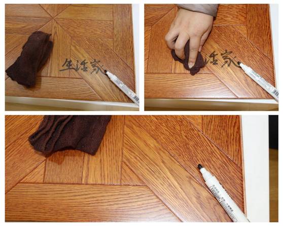 使用较难清除的油性笔在地板表面涂写字样,待字迹略干后,使用干抹布擦拭,使用一般力道,字迹很快就被擦拭干净。此款地板抗污力非常的棒,平时对生活污渍的打理会比较容易。