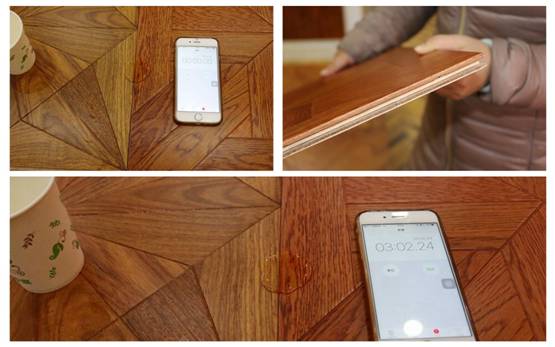 滴一滴清水在地板表面在两块地板的拼接处,用秒表计时,三分多钟后可以看到水珠没有任何扩散和渗漏现象。擦拭干净后,地板侧面也未出现浸湿变色情况。可见,此款地板有着很好的防水性能。