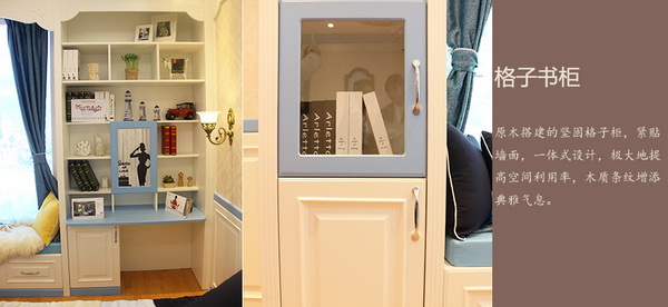 窗边柜:吸塑板构成的窗边柜,U型环绕设计,既能储物又可供休憩;等身高的开放式窗口让远近美景一览无遗;窗楣是精美的艺术雕花,时尚又不失典雅的风格彰显小资情调。
