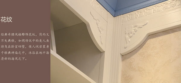 花纹:经典希腊风格雕饰花纹,简约又不失典雅,如同传说中的美人鱼游曳在卧室四壁,使人恍若置身于雅典神庙之中,沐浴在地中海清新的海风之下。