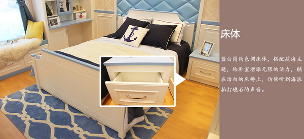 床体:蓝白简约色调床体,搭配航海主题,给卧室增添无限的活力,躺在洁白的床褥上,仿佛听到海浪拍打礁石的声音。