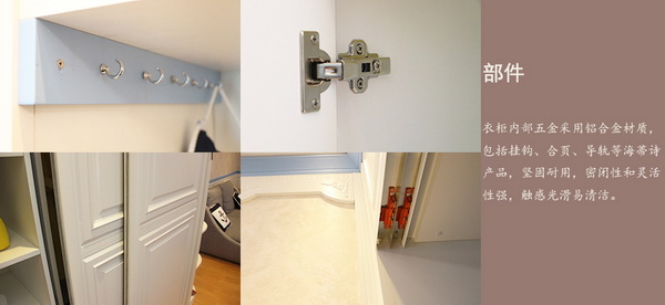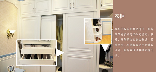 衣柜:衣柜门板采用移动滑门,能有效节省衣柜与床体的空间;抽屉、裤架子由铝合金制成,坚固耐用;柜体右方是半开放式设计,能有效保证鞋袜的透气性。
