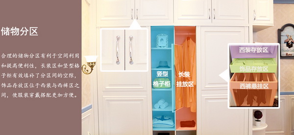 储物分区:合理的储物分区有利于空间利用和提高便利性,长装区和竖型格子柜有效填补了分区间的空隙,饰品存放区位于西装与西裤区之间,使服装穿戴搭配更加方便。