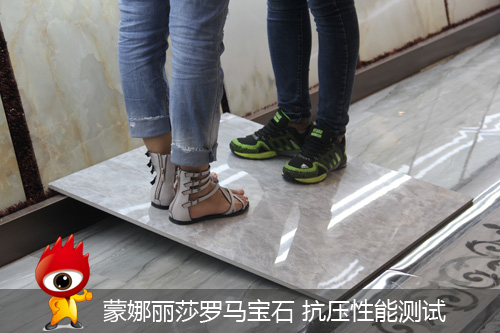 新型装饰通体瓷质砖采用国外进口材料,运用厚抛工艺技术,具有坚硬、耐磨的物理性能,莫氏硬度高达5.5。为了让您更直观的感受到TA的坚硬,我们将瓷砖倾斜一定的角度放在地面,让两位成年女子双脚站立在架空的瓷砖表面,经过一段时间后,瓷砖完好无损,没有出现弯折、碎裂的迹象,可见其硬度很高,承重能力很强。