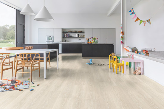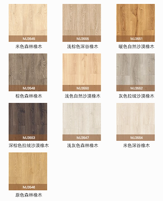 MJ3545米色森林橡木:这款地板以自然橡木纹理为灵感,简洁自然的色泽为家中带来平稳宁静的力量,地板结构与V槽的设计则使其外观更加柔和。