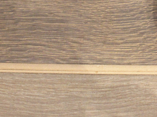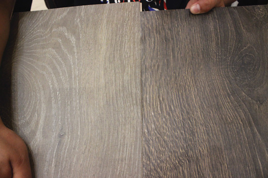 以灰色拉绒沙漠橡木这款产品为例,小编用手轻触地板表面,因该系列地板未在地板表面涂刷人工淋油,所以触摸起来顺滑舒服,又凹凸有致,店面导购介绍,这是因为生产时采用了轻柔工艺面,使地板表面有略微不平的凹痕,看起来宛如真木。对比表面平整的地板,至尊地板触摸后不会留下手印,看起来更加干净。