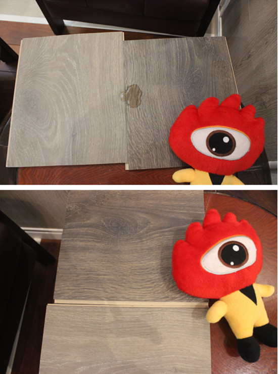 为了方便观察,小编使用灰色拉绒沙漠橡木地板和深棕色拉绒沙漠橡木地板进行拼接,拼接好的地板非常平整。小编尝试将地板向两侧用力拉扯,两块地板纹丝不动,浑然一体。