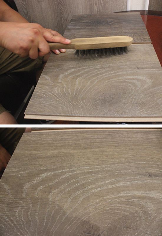 为测试地板的耐磨损能力,小编使用铁毛刷来回刮地板表面,1分钟后,地板丝毫无损。
