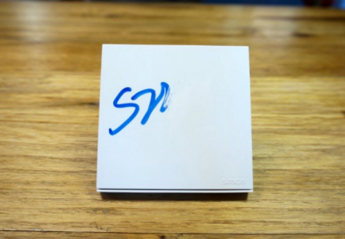 一般来说浅色的开关比较容易弄脏,偶尔小孩在上面涂鸦留下污渍的话,就要考虑它是否易于打理了。评测人员用油性笔在开关面板上写字,静置一段时间后,用餐巾纸擦拭,根本不需要用水和清洁剂,就能轻松将表面的污渍擦干净,且板面没有擦拭的划痕,干净如初。