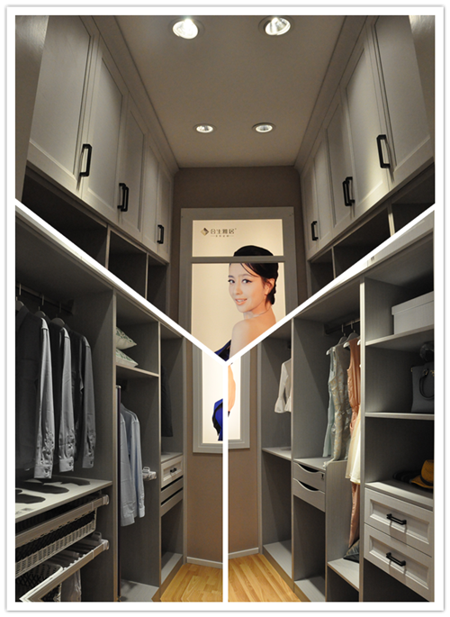 顶柜直接与天花齐平,可以存放一些换季的被子一类大件物品。两侧衣帽间可以根据自己喜好分为男主区域、女主区域,这样存放拿取互不干扰。
