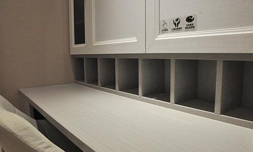 合生雅居这套产品主要采用板式柜体加吸塑面板,浅灰色与浅白色搭配的简欧风格,适合80~120㎡的四口之间的户型。