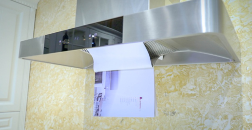 为了更直观的感受18m³/min的风力有什么效果,我们先用一本约25页的产品画册,展开后靠近油烟机的出风口(也就是滤网附近),立即能感受到明显的风力,我们把书页贴近风口,整本书就被吸在滤网上,没有掉落。这样看来,Haotaitai好太太E021的吸力还是很不错的。