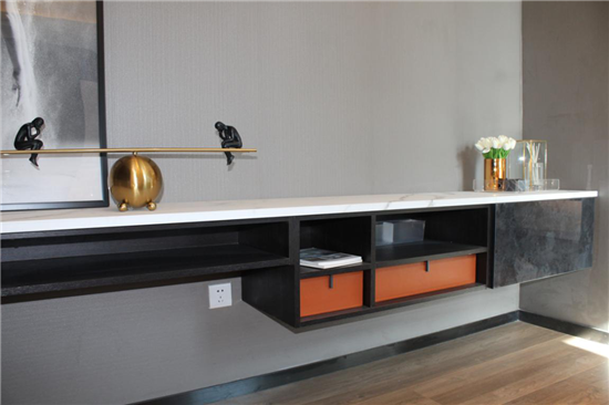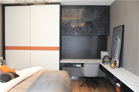 走进梵星卧室,映入眼帘的是两扇移门的衣柜,金丝黑檀的柜身,皓月白+橙色皮纹的设计时尚、大气端庄;和衣柜相接的七字形长桌,桌面为仿大理石制作的雪岩板,质地沁凉不冰冷;搭配金丝黑檀隔层和抽屉外加一点云墨石运用,大气美观,既考虑到随手物品的放置,又可收纳,非常方便。
