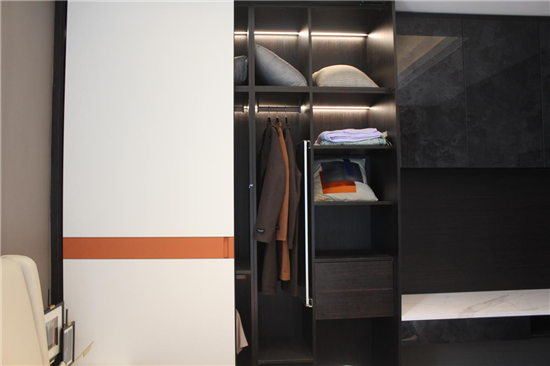 衣柜内部采用多元隔层收纳设计,以长储+短储+抽屉组合,不仅能最大化地利用内部空间,还方便不同衣物的分类归置,满足不同家庭成员的生活习惯;衣柜内还有灯轨设计,当打开柜门时,LED灯自动亮起,既能照明方便衣物收取,又能调动卧室空间的整体氛围,让星空的美好照进生活。
