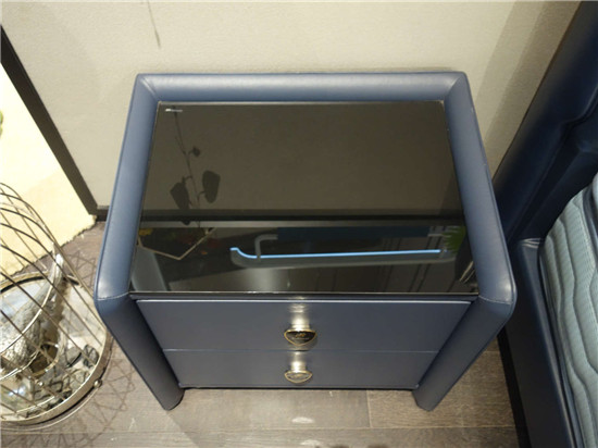 床头柜顶使用了厚厚的黑色镜面,制造出适合睡眠的微弱光反射,配合夜空蓝的皮面,像星光照在夜晚河面上。进一步强调亲密氛围,这也使整套产品极具辨识度,不易“撞衫”。