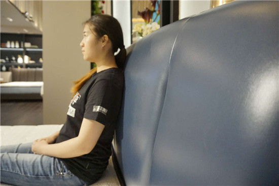 灵活的中高床屏。测试员身高160cm,床屏最高支撑到了后脑勺。即便是身高180cm的高个子,也能支撑到颈部。