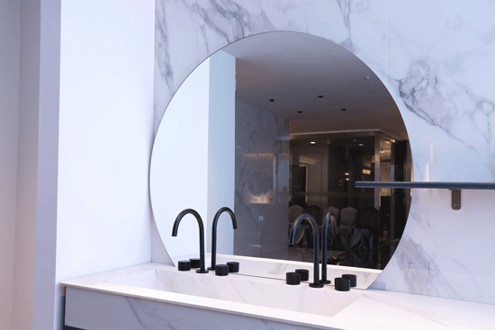 浴室柜的柜门把手采用了独一无二的满月造型设计,雪山石岩板的饰面与一体式台面相呼应,金属包边更是增添了金属和石材碰撞的时尚感,同时边缘处理得圆润光滑,手感舒适。