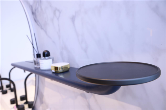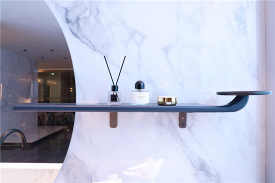 汲取“玉如意”设计元素的镜托,则宛如明月旁边的一丝云雾缭绕,与半圆形的浴室镜形成了交相辉映的和谐感。
