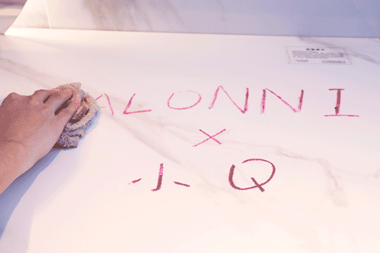 岩板的极高致密度和超低渗水率特性使污渍无法渗透。为了测试台面的清洁性能,小编用口红在台面写下”ALONNI×小Q“的字样,静置10分钟后,用湿布就能轻松擦除。以难清洁著称的口红污渍都能被快速清洁干净,看来岩板的易清洁特性名不虚传,足以抵抗日常生活的各种污渍。