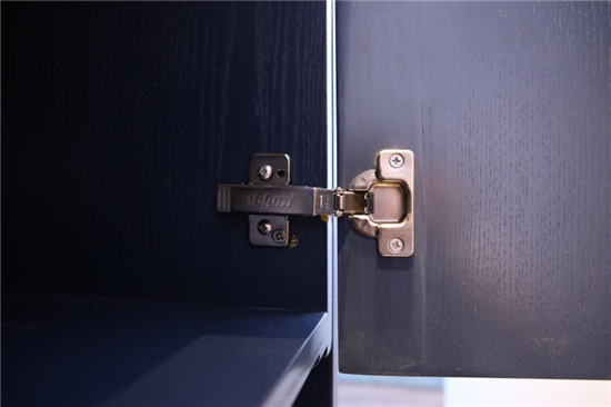 柜门采用的是百隆3代集成静音铰链,上面清晰标有“BLUM”字样logo,性能稳定不易生锈,品质有保障,能够有效延长产品的使用寿命。