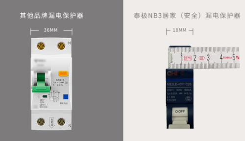 再来看一下产品的厚度,市场上常见的漏电保护器大多笨重宽大,而泰极NB3居家(安全)漏电保护器的厚度创新性地做到了超薄,宽度仅有18mm,十分轻薄精致,更省空间。