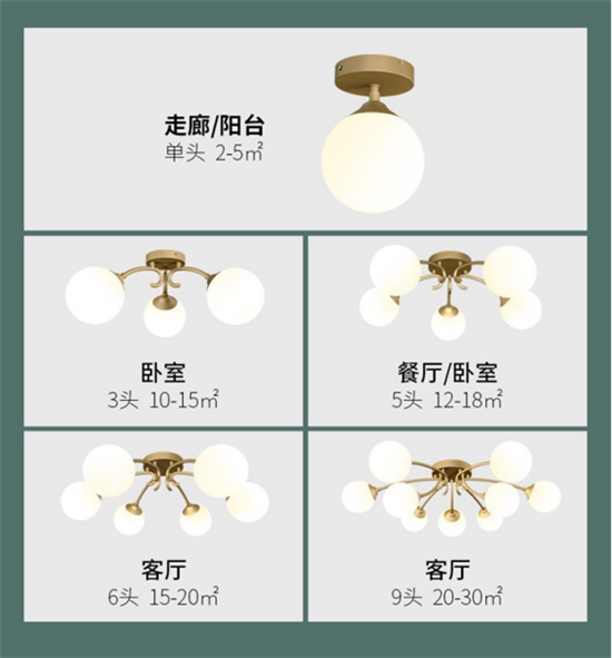 除了匹配不同户型之外,在每个空间场所中也有多达五种款式提供适配,比如,玄关过道及阳台这类的狭窄空间可以采用单头的款式,卧室、客餐厅可以根据面积使用3头或者5头的款式,更大一些的客厅可以在6头和9头的款式中灵活选择。