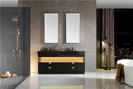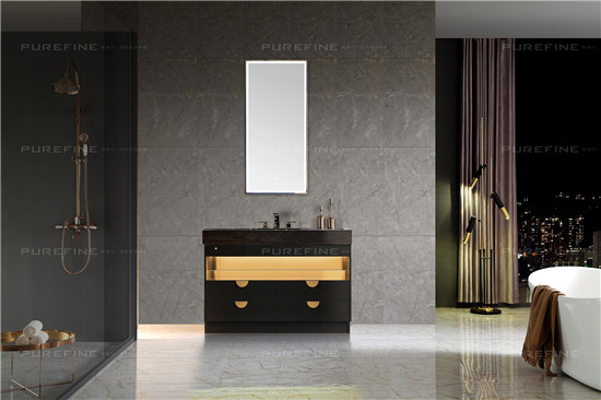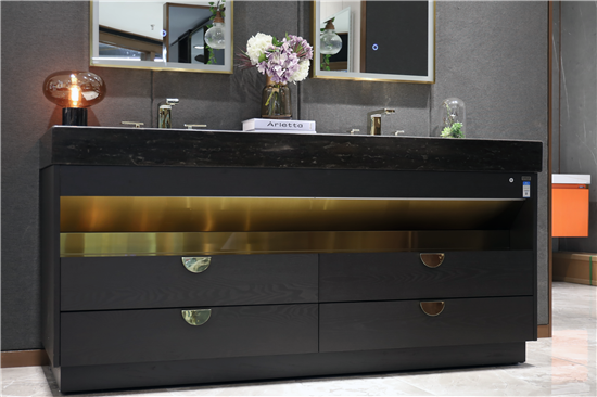 “眼界”系列的这款浴室柜设计简洁,国际化。轻奢调性的加持下,经典的黑金配色碰撞出高贵而沉稳的格调,金色在深色柜体的衬托下,精致又灵动。