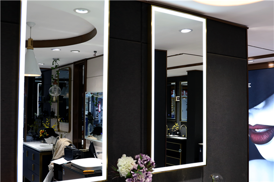 五层镀银的镜面光洁平滑、成像清晰。火光贴近,能够清晰地呈现出渐次交叠的五层虚影。经过特殊处理的镜面还能快速散雾,置一杯热水在镜子下模仿沐浴的场景,约5秒,凝结在镜面的水汽就能消散,镜面清晰如初。