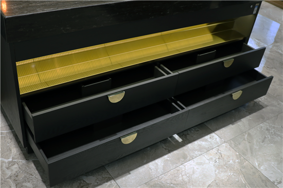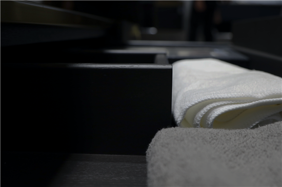 柜门拉手采用了非常特别的半圆形,柜体的方和拉手的圆,暗含东方天圆地方的朴素哲学,中和整体线条与金属的凌厉感,浪漫而精致,彰显星级酒店的轻奢气质。使用感也非常舒适,手指轻轻一勾,就能轻松将抽屉勾出来。