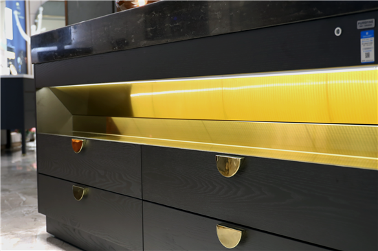 当感应灯亮起,柔和的灯光打在金色置物格上,“眼界”就会展现出它的另一面,这款浴室柜设计的特别之处便在于此。柜体颜色深沉,而置物格通体金色,初看是纯粹的黑金撞色,近看才会发现,柜体的颜色由专业调色师调制,是一种“五彩斑斓的黑”——隐隐透出的棕色像夜空中的暖光,被命名为“极夜棕”。当灯光亮起,置物格仿佛太阳照耀下水波粼粼的海面,隐秘、低调,冲破沉闷的暗夜,带来全新的一天,全新的冒险之旅。