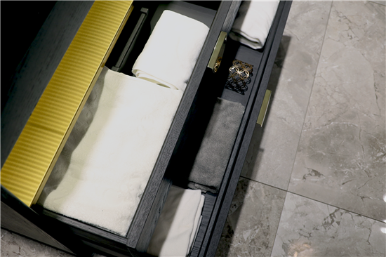 抽屉的设计更是收纳王牌,便于实现物品的分类,提高空间利用率。日常用到的洗脸巾、吹风机、浴帽等收进去,不占用外部空间,存取也方便。所有的瓶瓶罐罐和毛巾、备用物品都能告别杂乱拥挤,在分层且对称的抽屉收纳之下,轻松维护浴室空间的清洁度,养眼与秩序两不耽误。