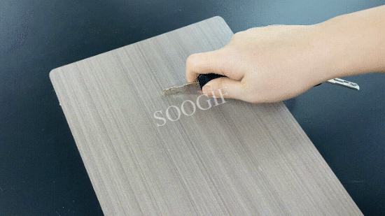 生活中难免使用到有尖锐表面的物品,比如搬东西时的磕磕碰碰,钥匙等金属的随手一扔,千年舟能否经得住生活中金属物体的“误伤”呢?我们随手拿了一把评测人员家的开门钥匙,在板材表面反复用力刮擦,产品表面并没有留下刮痕。