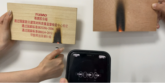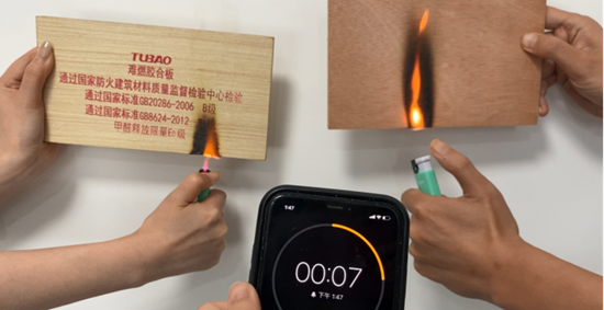 根据评测视频可以发现,与普通多层板相比,在同等引燃环境下,兔宝宝难燃板的燃烧火苗小、几乎无冒烟情况、移走火源后燃烧点火苗马上消失并无复燃情况。
