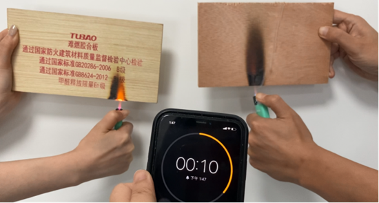为了更直观的测试兔宝宝难燃板的阻燃性,评测员准备了一款市面上普通的多层板,在同样环境下,使用同样的引燃火源,在相同时间内同时点燃两款样板,观察其阻燃性。